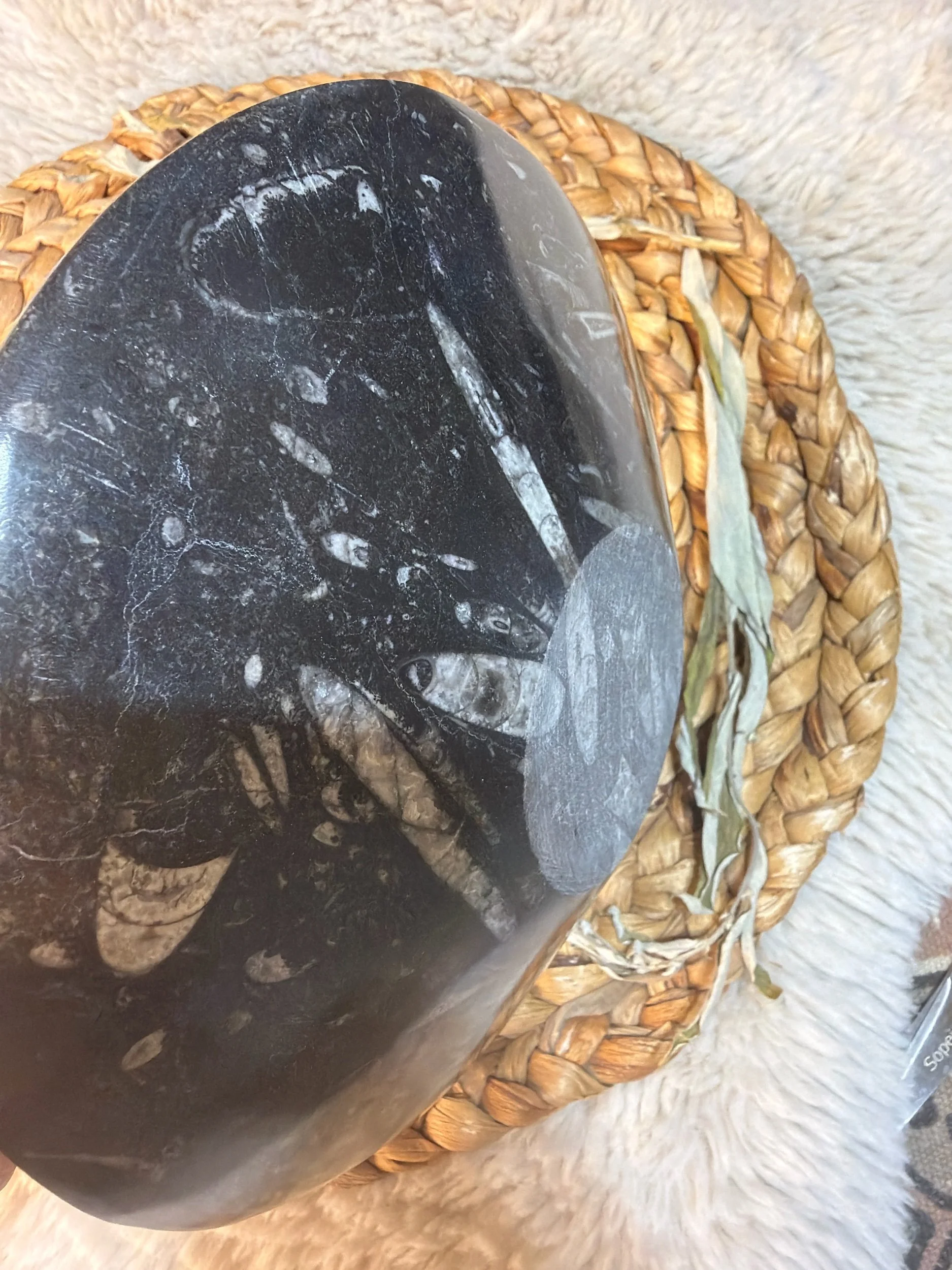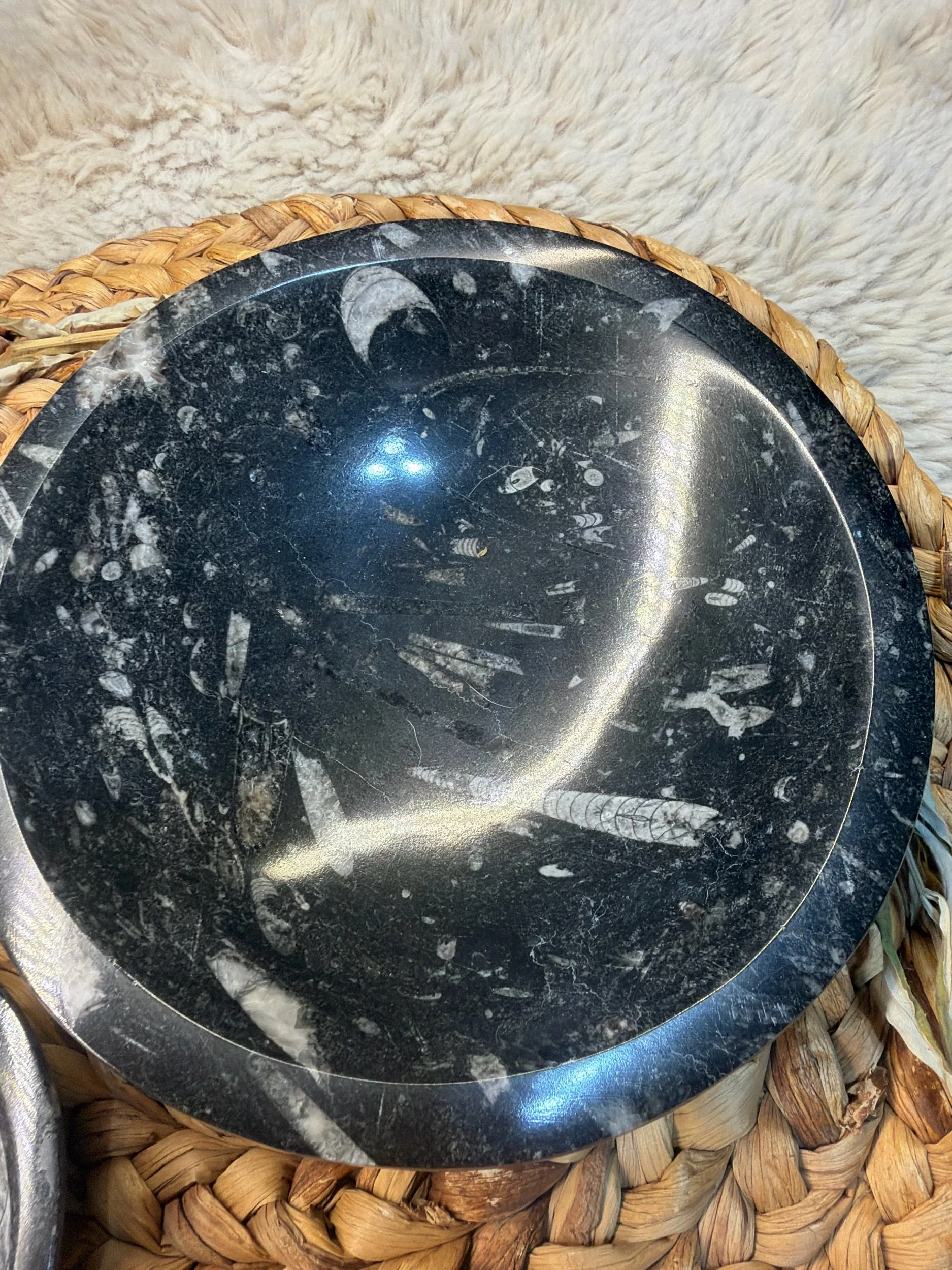 This 8-inch Orthoceras fossil bowl carries the imprint of life that existed over 400 million years ago. Each fossil visible in the stone once moved through ancient oceans long before modern life began. What you hold in this piece is not simply stone, but preserved movement through time.