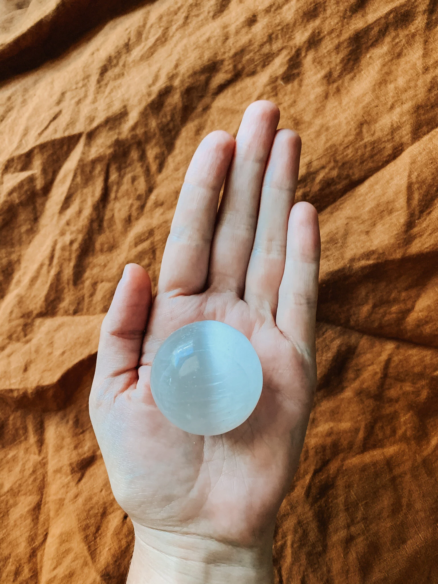 This selenite sphere is one of the most powerful cleansing crystals you can bring into your home. It continuously clears stagnant energy from any space it lives in, and it never needs to be cleansed itself.